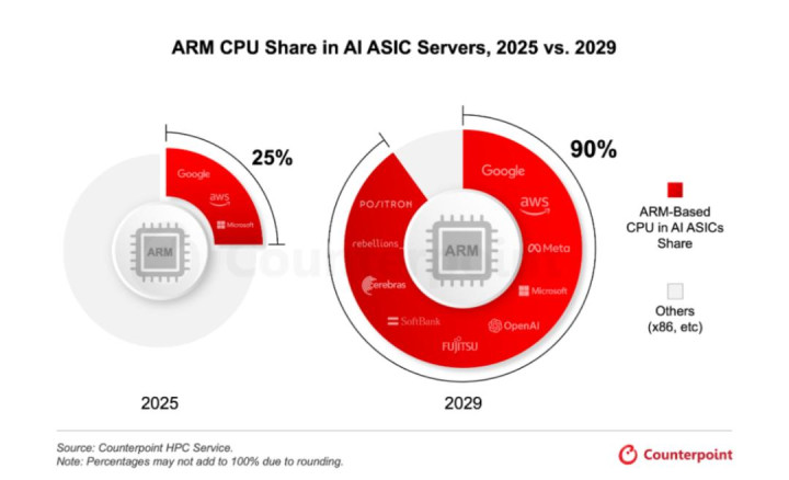 到2029年,基于Arm的CPU将占定制AI ASIC功绩器主机CPU部署的至少90% ,高于2025年的约25%。