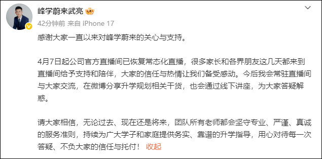 4月7日,在张雪峰老诚离世半个月后,其创办的“峰学畴昔”团队讲求收复直播。