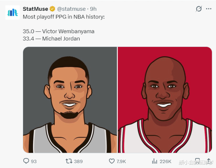 因为22岁的文班亚马首场季后赛就如斯爆炸,数据媒体StatMuse用乔丹簸弄他,数媒写说念:文班亚马首秀35分,乔丹季后赛场均33.4分不足文班。