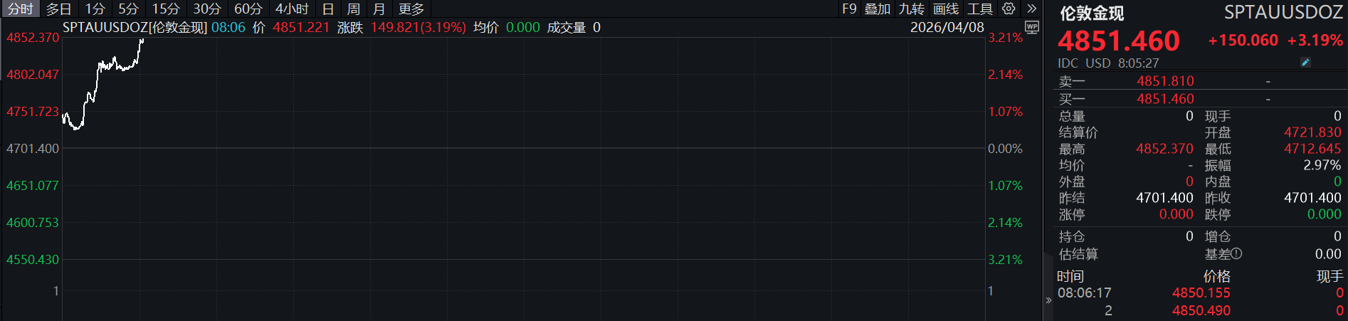 08:05 现货黄金站上4850好意思元/盎司,日内涨3.19%。
