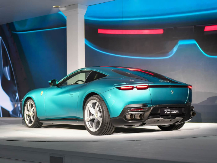 再来看车尾部分,法拉利Amalfi的车尾运筹帷幄相通令东说念主印象久了。车顶线条当然向后蔓延,与壮硕的肩线汇合在一齐,最终积累于车尾的主动式扰流板上。尾灯掩蔽在扰流板之下,采选了点阵式运筹帷幄,点亮后极具辨识度。尾灯之间也由深色的凹条所吞并,与车头的聚积式运筹帷幄相呼应,变成了首尾呼应。车尾下方是宽大雄厚的后扩散器,搭配双边四出排气管,营造出浓烈的说明气味。